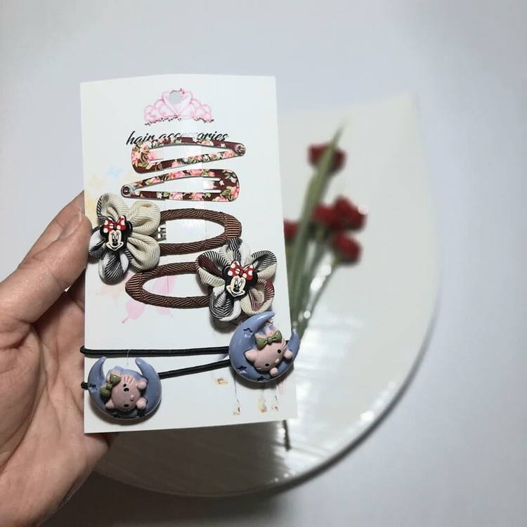 شامل : 📍1 جفت گیره تق تقی گلدار 📍1 جفت کش مو عروسکی جفتی 📍1 جفت گیره تق تقی فلزی عروسکی با روکش پارچه ای