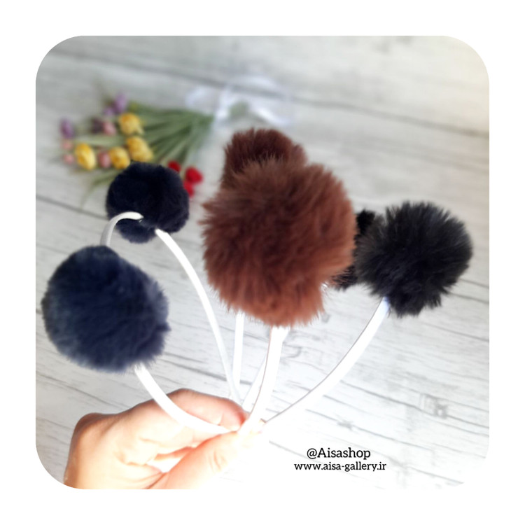 📍تل پوم پومی جنس بدنش فلزیه و با پارچه ی نازکی روکش شده 📍دو تا پوم پوم روی تل نصب شده 📍پوم پوم رنگ مشکی و سرمه ای کمی کوچیکتر ه ولی قهوه ای بزرگتر
