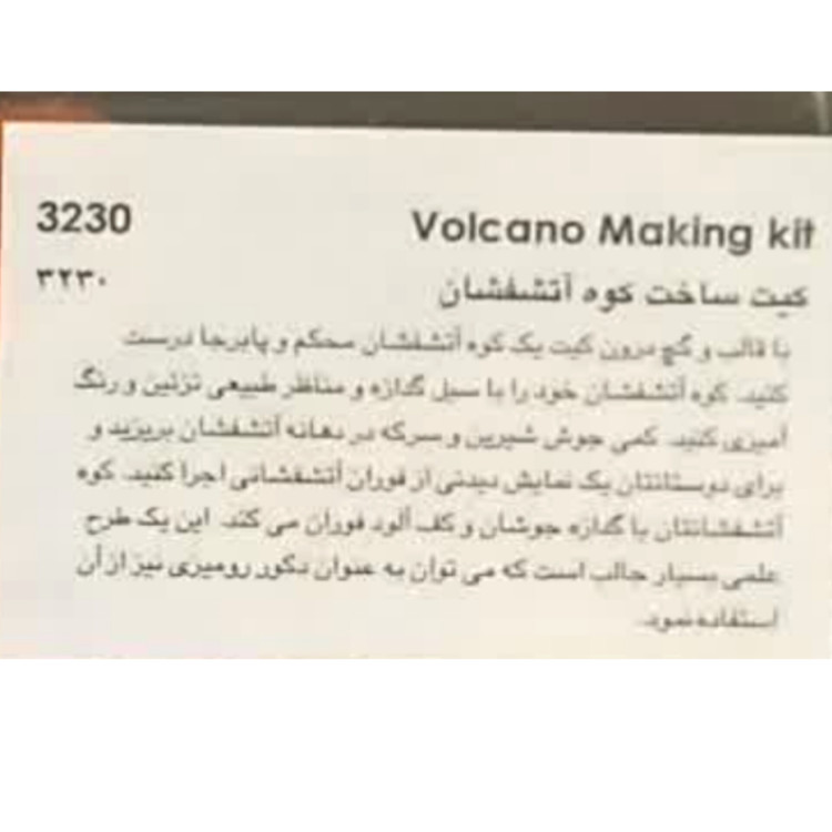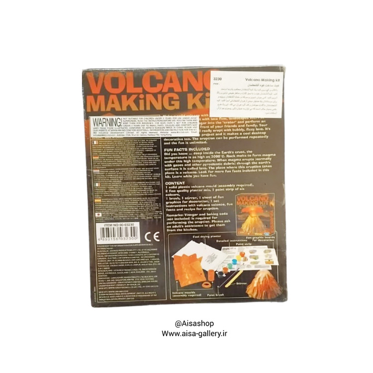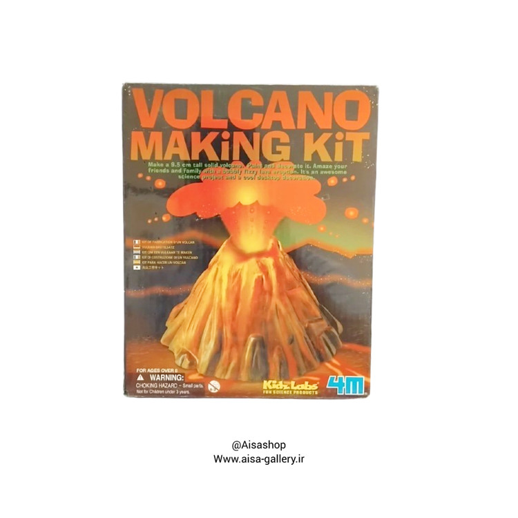 · محتوای جعبه: قالب ساخت آتشفشان، رنگ مخصوص، جوش شیرین، اسید سیتریک، ابزار اندازهگیری و راهنما