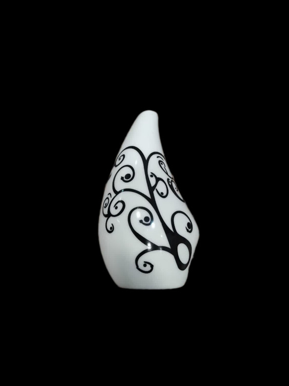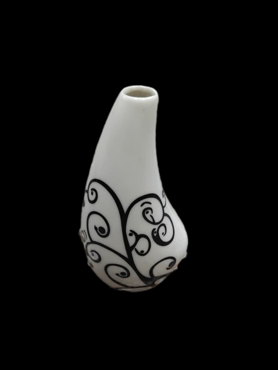 یک گلدان کوچک با فرم فانتزی و منحنی به رنگ سفید براق که دارای طرحهای اسلیمی مشکی (پیچک) در قسمت بدنه است. این گلدان به دلیل دهانه باریک، برای نگهداری یک شاخه گل طبیعی یا مصنوعی و همچنین تزئین میز کار و شلفهای دیواری بسیار مناسب است.