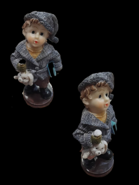 مجسمه فانتزی با جزئیات بسیار دقیق که کودکی را با کلاه و لباس بافتنی خاکستری نشان میدهد که یک عروسک کوچک در دست دارد. این محصول برای اتاق خواب یا شلفهای فانتزی بسیار مناسب است.