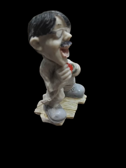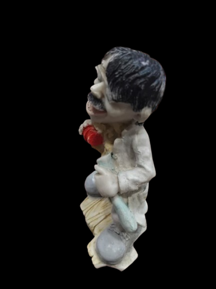 یک مجسمه کوچک رزینی با طراحی طنزآمیز و اغراقآمیز (کله بزرگ). این فیگور کاریکاتوری با جزئیات عینک و سبیل، گزینهای سرگرمکننده برای تزئین میز و کلکسیونهای فانتزی است.