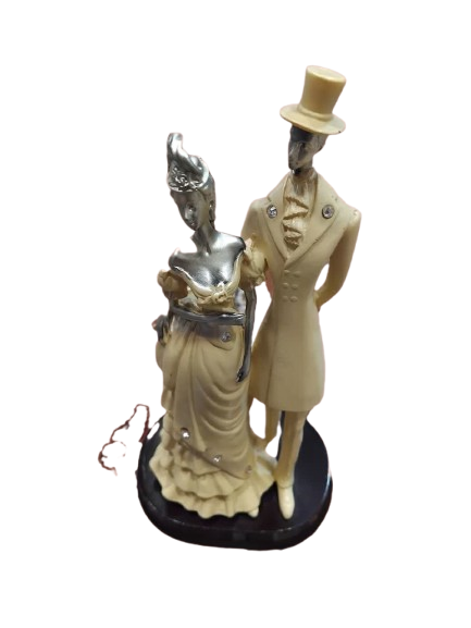 این مجسمه فیگور یک زن و مرد با پوشش رسمی و کلاسیک (سبک اروپایی قدیم) را نشان میدهد. مرد با کلاه سیلندر و کت بلند و زن با پیراهن پرچین طراحی شده است. بدنه ترکیبی از رنگ کرم استخوانی و نقرهای براق است که با نگینهای کوچک تزئین شده و روی یک پایه دایرهای قرار دارد.